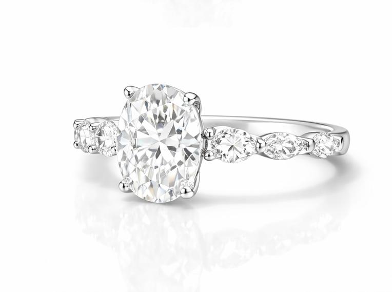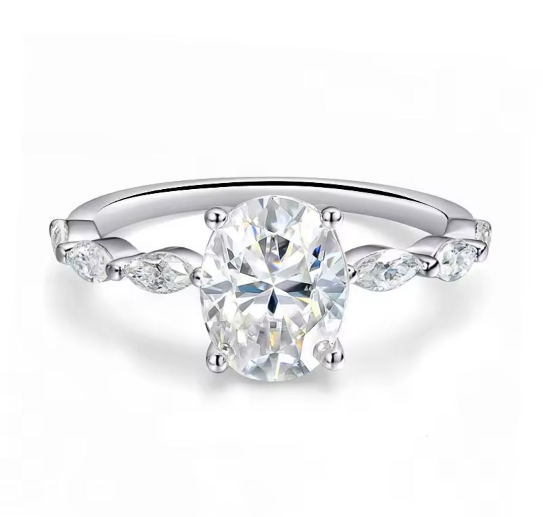 At its center rests a luminous oval-cut premium stone, elegantly secured in a delicate four-prong setting that enhances brilliance and fire. The band is adorned with marquise-shaped accent stones, creating a soft flow of sparkle that complements the elongated silhouette of the centerpiece.