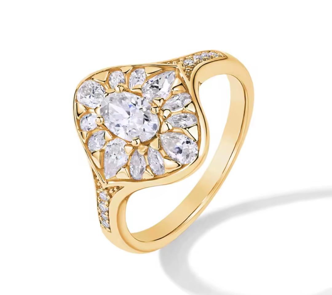 The Aurora Bloom Halo Ring is a radiant expression of elegance and refined craftsmanship. Designed to capture the brilliance of a blooming flower, this striking piece features a dazzling round center stone surrounded by delicately arranged marquise and round-cut stones that form a luminous floral halo. Set in a polished gold band, the intricate openwork design allows light to pass through each stone, enhancing its sparkle and brilliance.