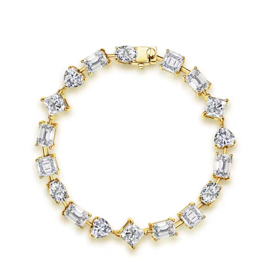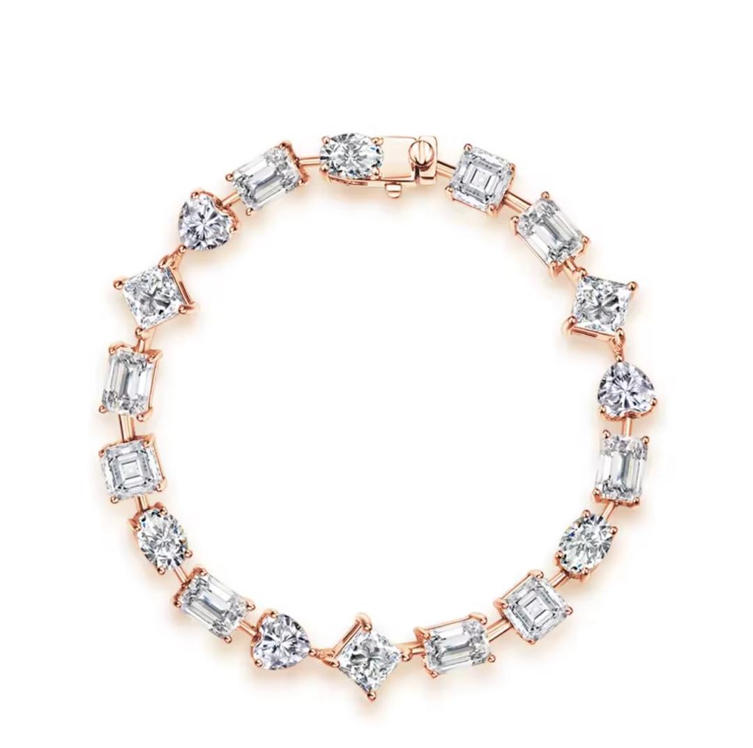 Elevate your elegance with the Élan Royale Tennis Bracelet, a breathtaking fusion of brilliance and artistry. Designed with a captivating sequence of multi-cut moissanite stones including round, emerald, princess, and heart shapes, this bracelet reflects light from every angle, creating an irresistible sparkle. Each stone is meticulously set to form a seamless flow of radiance, making this piece the perfect statement of sophistication.
