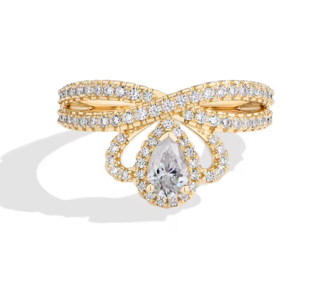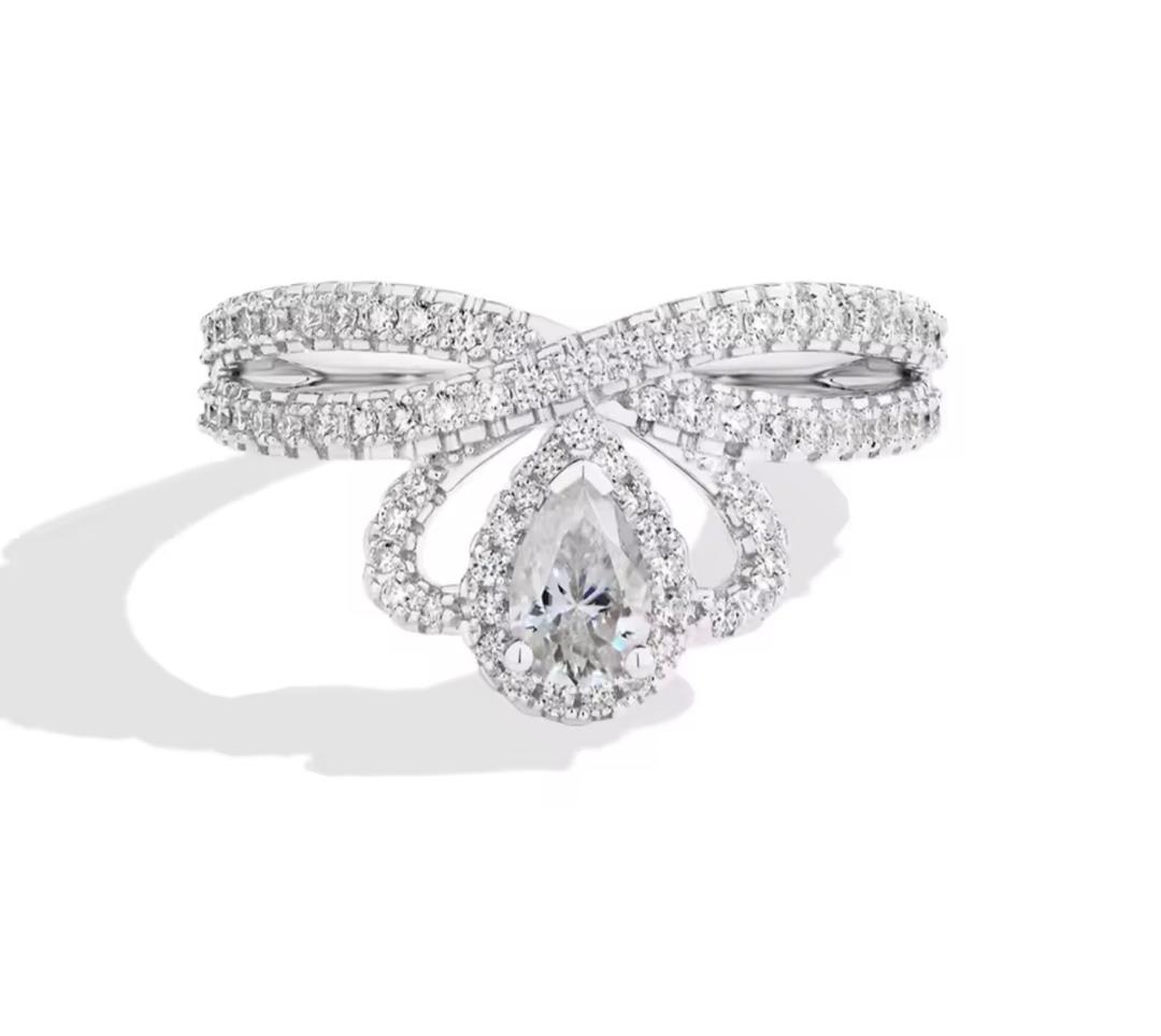 Delicate yet captivating, the Zinara Bow Radiance Ring is a symbol of grace, beauty, and timeless femininity. Designed with an exquisite bow motif, this piece features a dazzling pear-cut center stone that gently cascades into a pavé-set silhouette, creating a soft, radiant sparkle from every angle. The intricate double-band design adds depth and elegance, making it a perfect statement of refined luxury. Whether worn as a symbol of love, self-expression, or celebration, Zinara embodies sophistication with a playful charm.