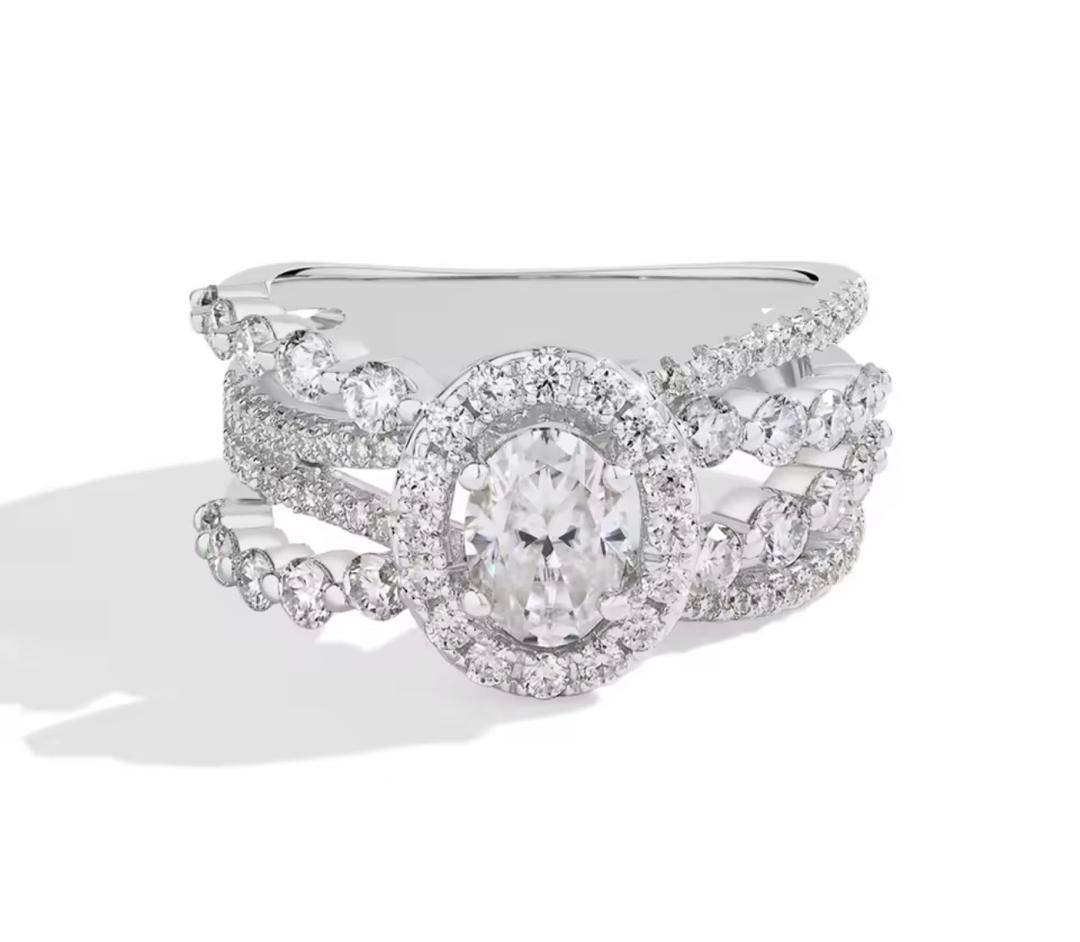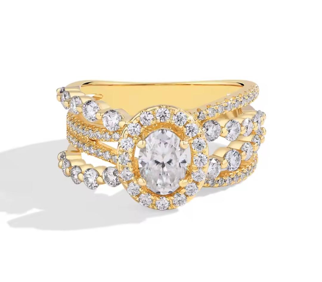 Command attention with the Velmora Crown Halo Ring, a masterpiece designed for the woman who embodies elegance and power. At its center lies a brilliant oval-cut stone, encircled by a radiant halo that enhances its fire and brilliance. The multi-layered band flows like a royal crown, adorned with shimmering pavé and bezel-set stones that create depth, texture, and unmatched sparkle. Each curve is crafted to reflect light beautifully, making this ring a true symbol of luxury, confidence, and timeless sophistication.