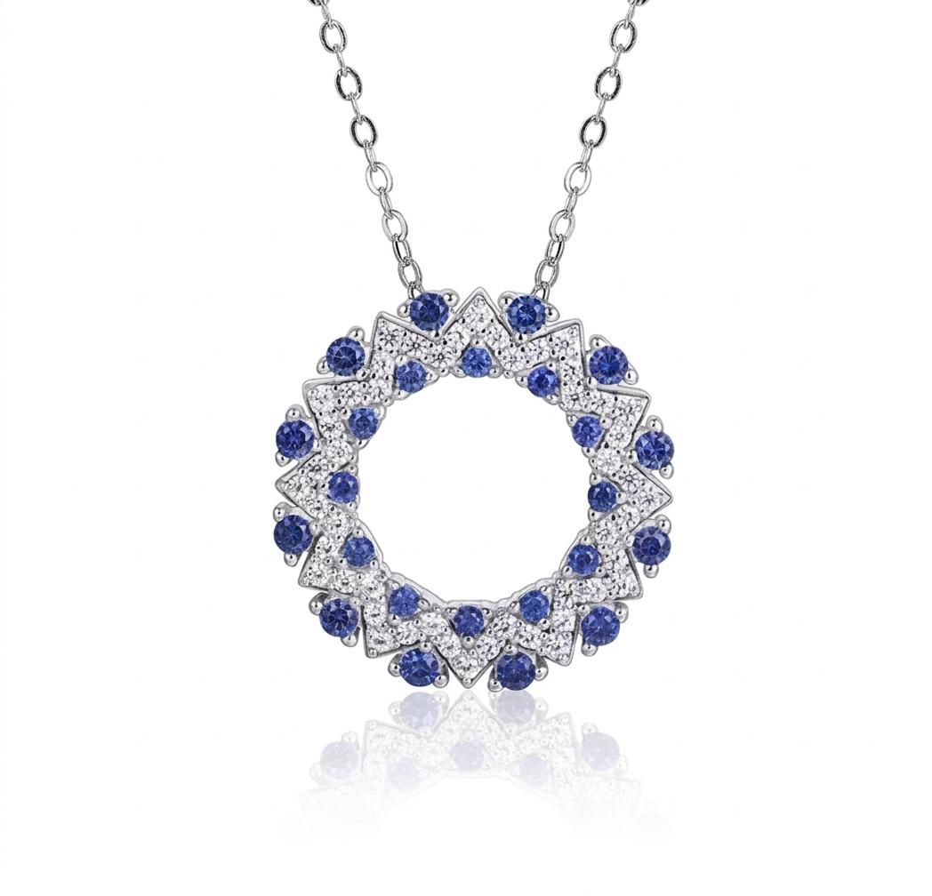 Capture the brilliance of the cosmos with the Yidlang pendant. Taking its name from the Kilba word for Star, this pendant features a geometric starburst pattern that draws the eye inward toward its perfectly balanced center. The piece showcases a meticulous pavé setting of white gemstones, punctuated by vibrant blue sapphires that add a regal pop of color. The jagged, star-like edges give the piece a modern, architectural feel while maintaining a classic feminine charm.