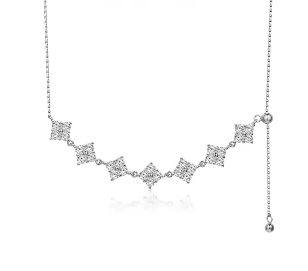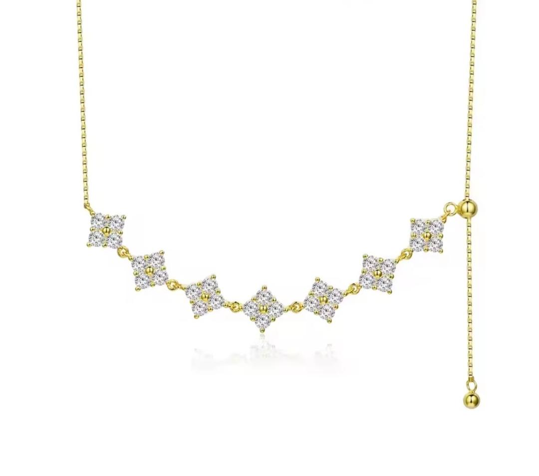 Celebrate the brilliance of connection with the Zari necklace. Taking its name from the Kilba word for Golden, this piece features six meticulously crafted floral stations, each blooming with high-clarity moissanite. The clusters are linked by a fine 18k yellow gold chain, creating a curved silhouette that rests perfectly against the collarbone. What sets this piece apart is its adjustable slider mechanism, allowing you to transition from a classic choker length to a longer, more relaxed drape. It is a modern heirloom designed for the woman who values both luxury and versatility.
