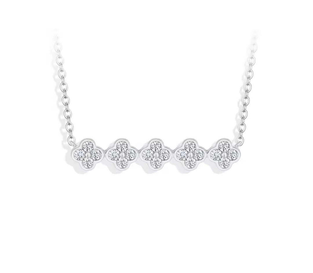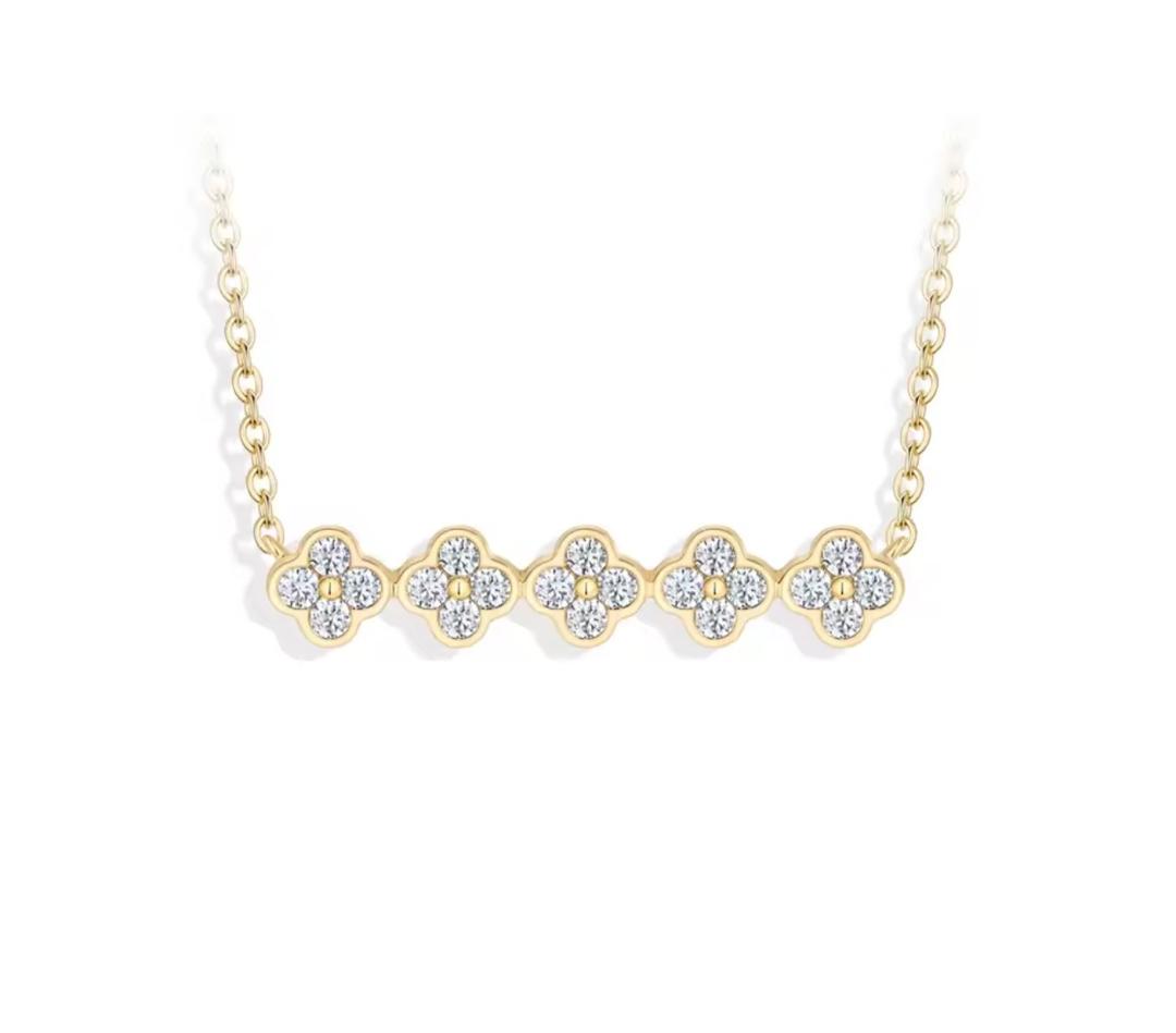 The Tumbira-Kula necklace is a masterpiece of connection. Its name, signifying United Ornaments in Kilba, reflects the five interlocking motifs that work in perfect harmony. Unlike a single pendant, this bar-style arrangement offers a wider field of brilliance, catching the light from multiple angles simultaneously. The fine cable chain is integrated directly into the design, allowing the floral bar to sit flush against the skin for a comfortable, streamlined look. This necklace is a symbol of strength in numbers a radiant reminder of the community and love that surround us.
